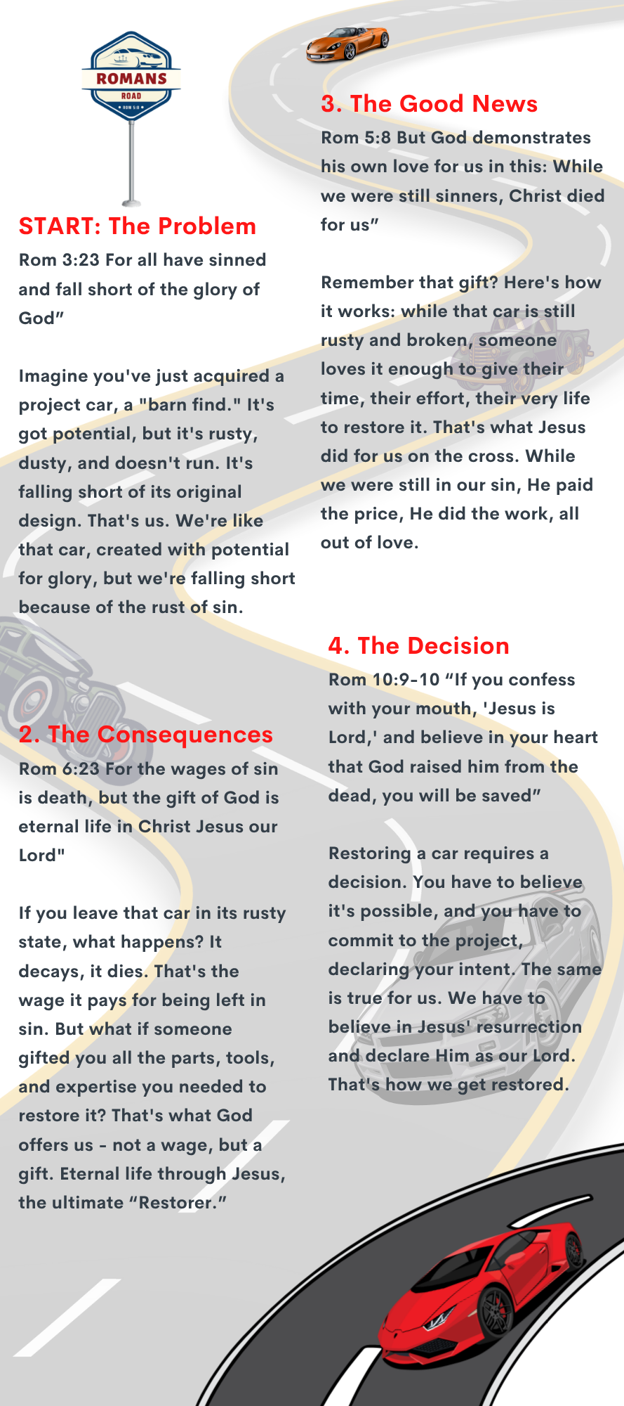 We give away Hot Wheels to kids as a fun way to share John 3:16, which reminds them that eternal life is a free gift in Jesus. Our gospel tracts use the picture of a car restoration to explain how Christ restores our broken lives through the Romans Road.